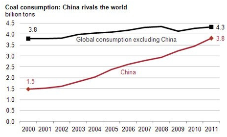 煤炭是中国最重要的能源来源。中国的煤炭产量、消费量均为世界第一,几乎相当于全世界其他国家的总和(来源:US Energy Information Administration)。