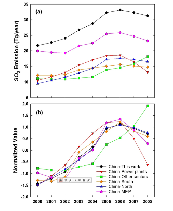 与此同时,中国的二氧化硫排放量是这样的 (Lu et al., 2010):
