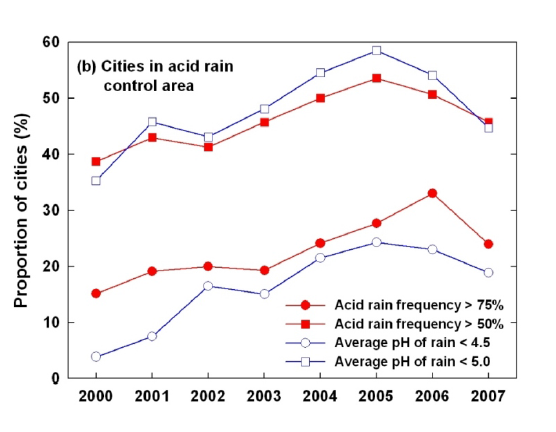 与此同时,以下是酸雨区酸雨发生的频率变化: