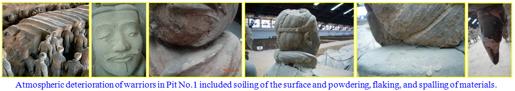 Key Lab of Aerosol Chemistry & Physics (KLACP), Institute of Earth Environment, Chinese Academy of Sciences (IEECAS) dedicate to indoor air quality in site museums in China since 2002. After several monitoring campaign, a long-term IAQ database was firstly established in Emperor Qin’s Terra-Cotta Museum (QTM). Weathering of material was observed on the outer part of the terra-cotta statues. Fluctuations of indoor temperature and relative humidity, and high concentrations of acidic aerosols inside Pit No.1 were found, which could have adverse effects on the statues.
